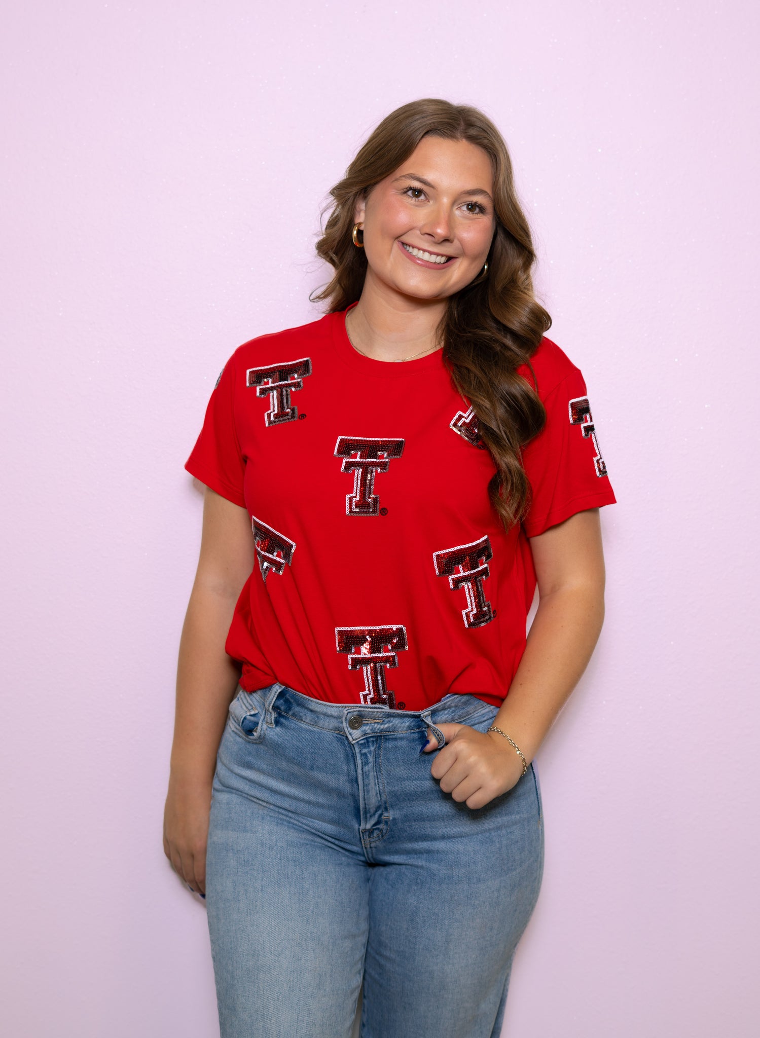 Show your Red Raider pride with this officially licensed Texas Tech top featuring scattered sequin-embroidered logos. A spirited, game-day ready look that shines with team pride! Buttery soft fabric with sequins!